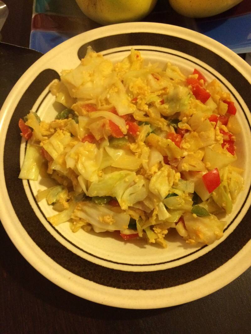 Een orak arik uit de tijd dat ik het ei nog rauw er doorheen rammelde. Het ziet er niet strak uit, maar smaakt wel lekker. Grotere stukjes kool (daar hou ik van) op een niet zo’n flatterend bordje waardoor het gerecht flets overkomt. Sorry daarvoor; ik zal m’n leven beteren.